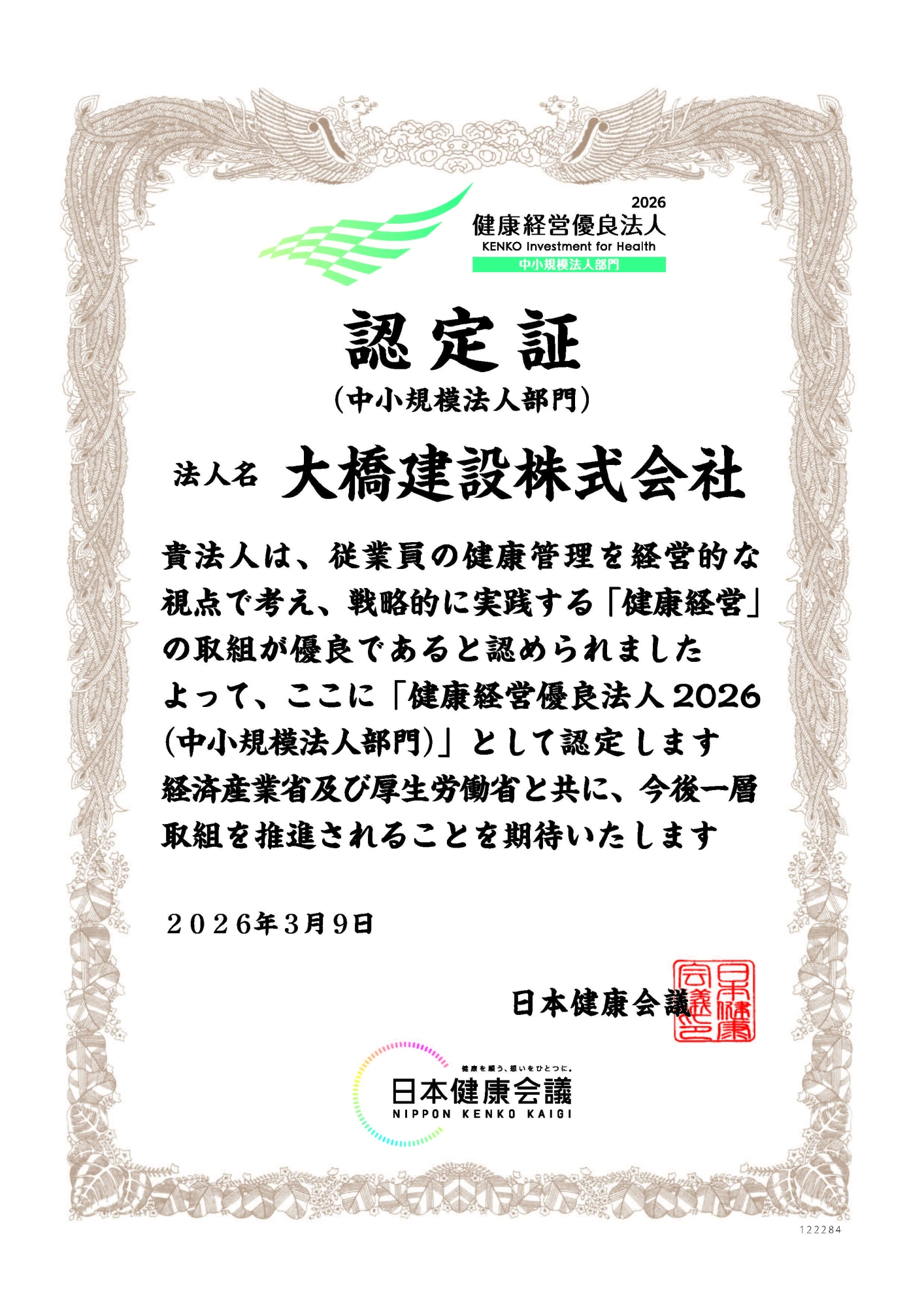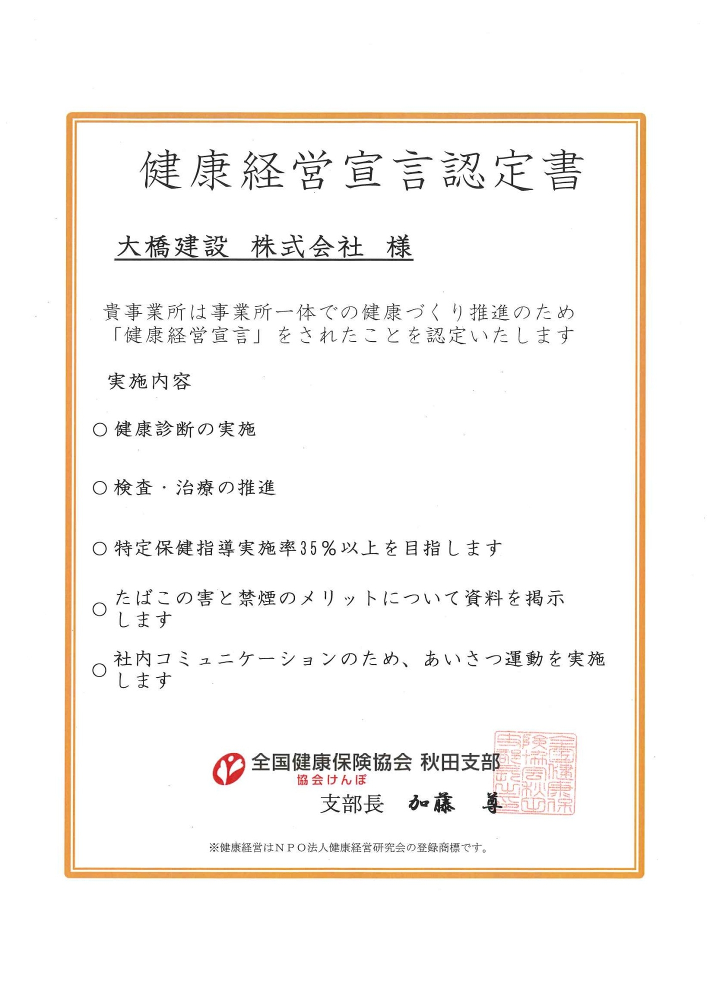 弊社は「健康経営宣言」を行い、全国健康保険協会(協会けんぽ)秋田支部に認定されております。